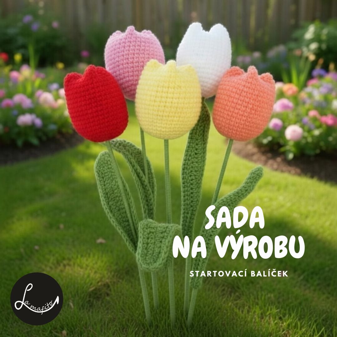 Vše potřebné na 5 háčkovaných tulipánů v životní velikosti je pro vás připraveno - příze, výplň, drátek na listy, háček i návod.