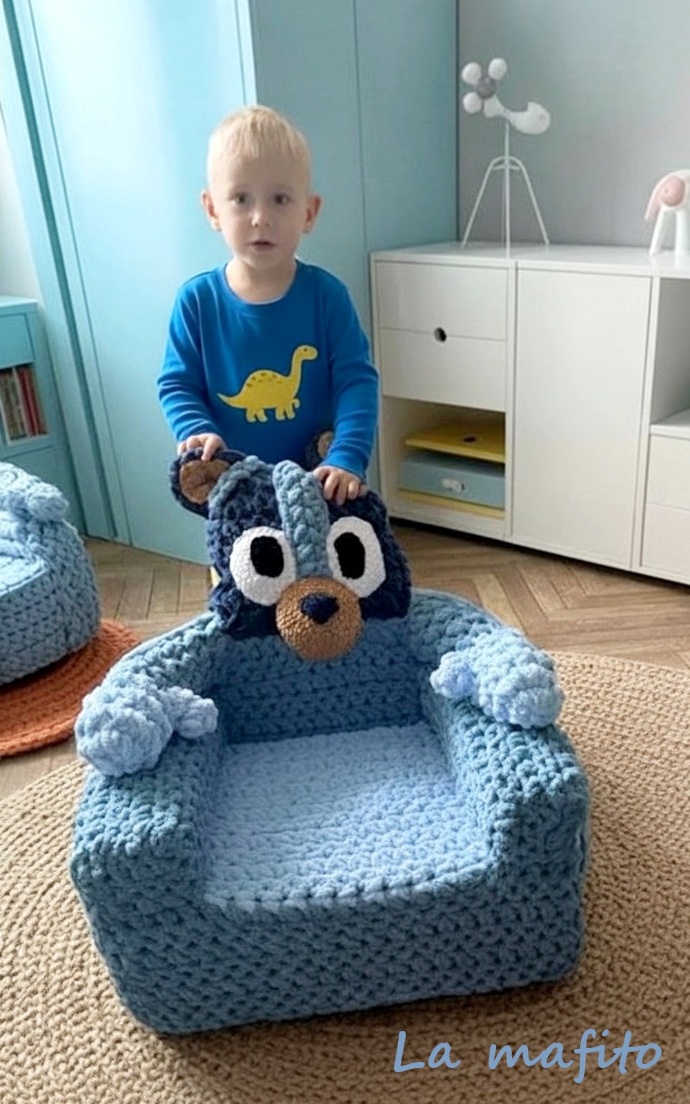 Křeslo je vyrobené technikou háčkování na rukou z velmi příjemné žinylkové příze Alize Puffy.