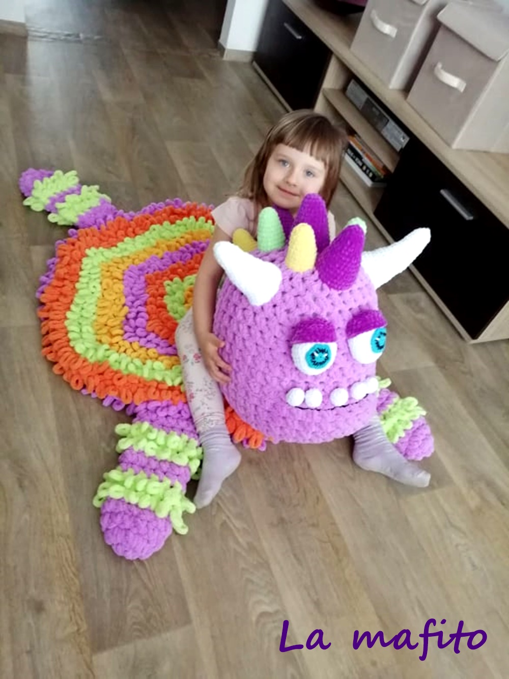 Naše příšerka je vyrobená technikou háčkování na rukou z velmi příjemné žinylkové příze Alize Puffy.